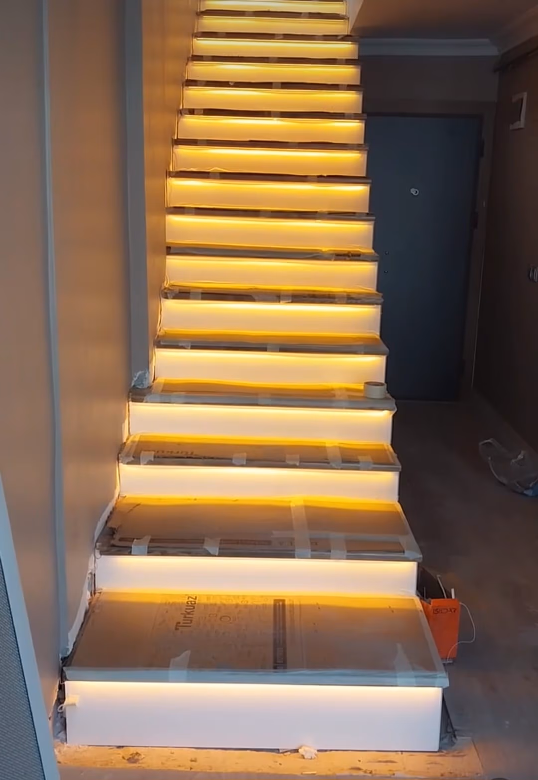 Merdiven basamaklarına entegre edilen hareket sensörlü şerit LED uygulamaları ile güvenlik ve şıklık.