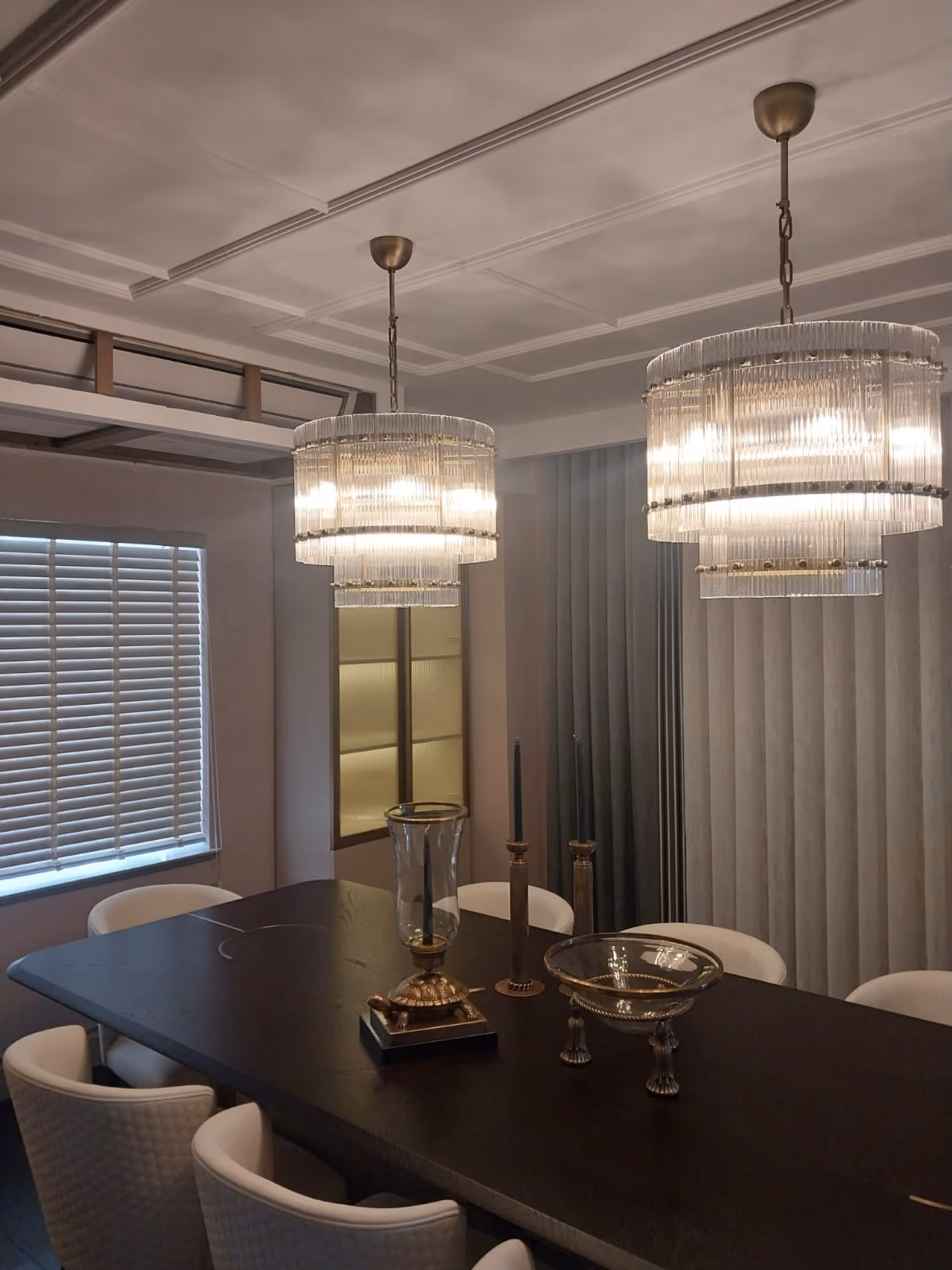 Yemek odalarına sıcaklık ve modernlik katan, özel tasarım avize ve raf altı gizli aydınlatma çözümleri.