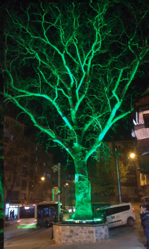 Peysajın yıldızı olan ağaçları, gövdeye monte edilen veya zeminden vuran renkli spotlarla vurguluyoruz.
